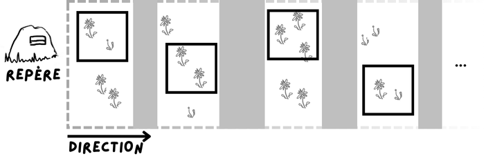 Reproduisez cette observation 10 fois (au total) en déplaçant chaque fois le quadrat dans la direction indiquée pour le site. Espacez les quadrats d'environ 2m, en alternant si possible les côtés. Bien inclure l'espèce cible dans chaque quadrat quel que soit son stade (fleuri ou non). Pour limiter le piétinement de la zone d'étude essayez de vous déplacer autour de la zone.